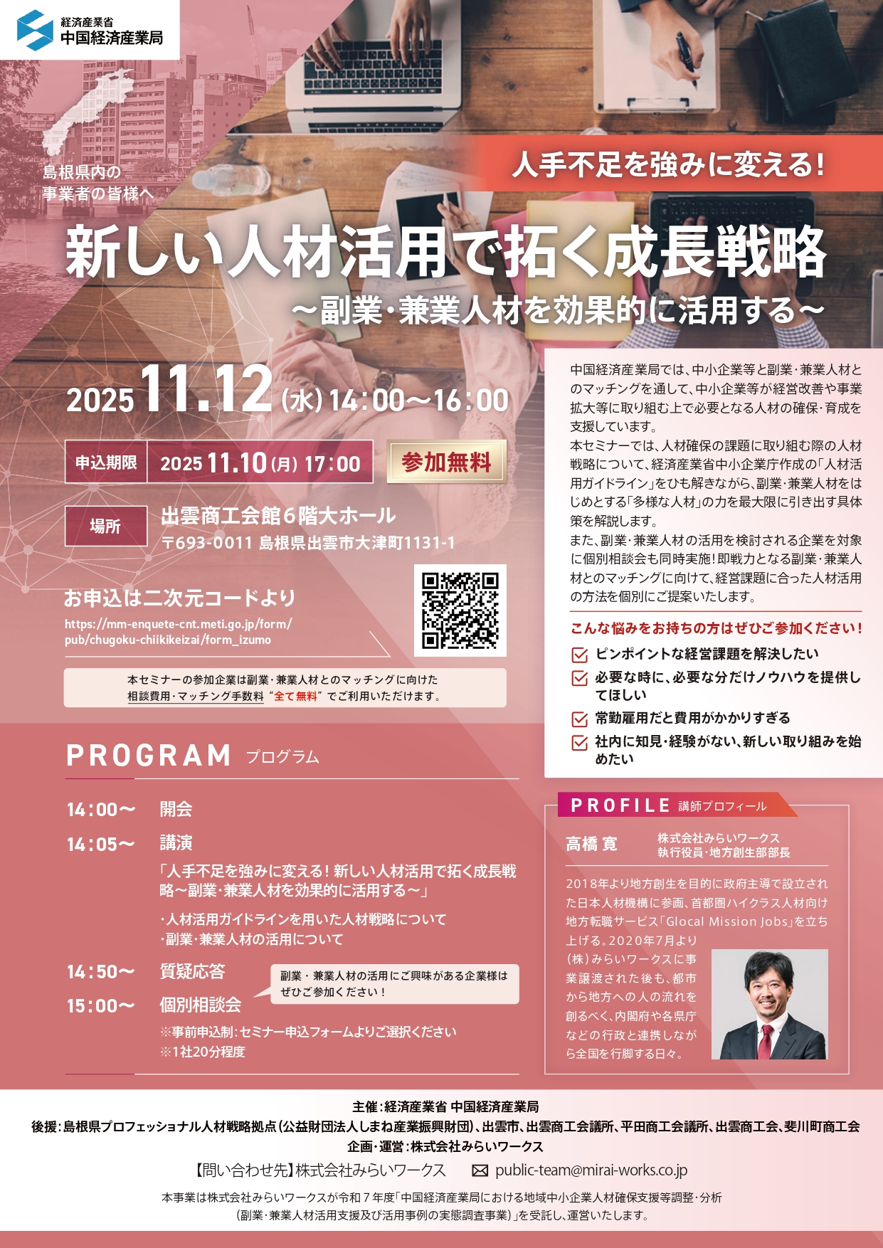 中小企業等が経営課題解決に取り組むうえで必要となる人材確保について、多様な知見・経験をもった副業・兼業人材を効果的に活用する方策を解説するセミナーです。また、これから即戦力となる副業・兼業人材の活用を検討されている企業を対象とした個別相談会も計画されているますので、ぜひご参加下さい。