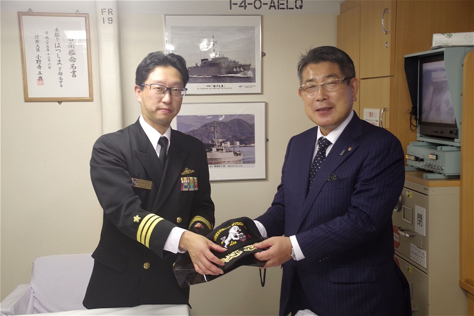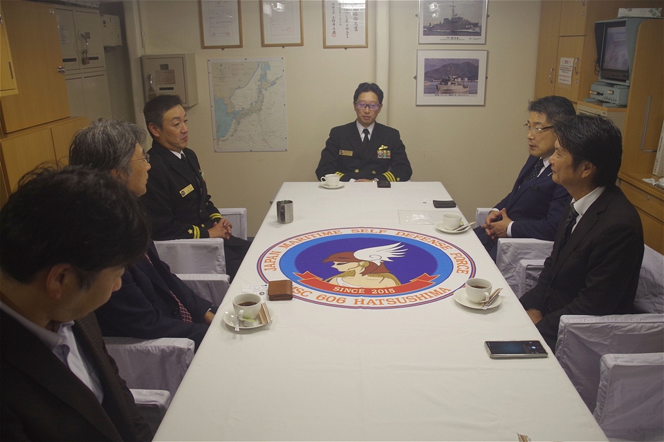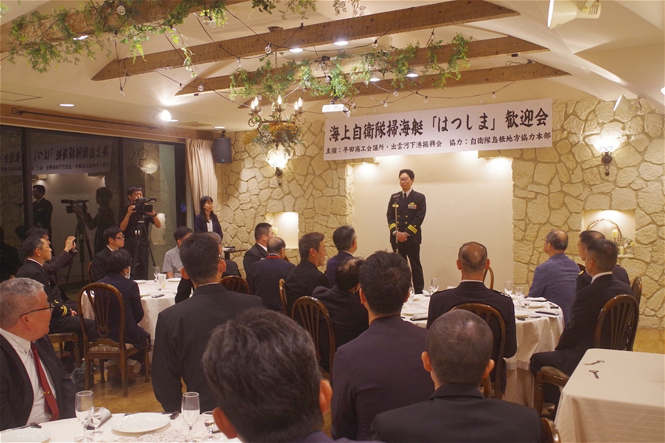 入港を出迎えた平田商工会議所の石原会頭や出雲河下港振興会事務局である出雲市産業政策課は、第44掃海隊石田司令・はつしま高橋艇長と災害時の復興拠点となる港湾機能の充実等について情報交換を行いました。東日本大震災の支援を経験された石田司令からは、陸路が寸断される大規模災害においては海上からの物資輸送が有効であり、実際に港湾のある集落から復興するケースが多いので、訓練や艦艇広報で定期的に入港することは非常に重要であるとの話をいただきました。
