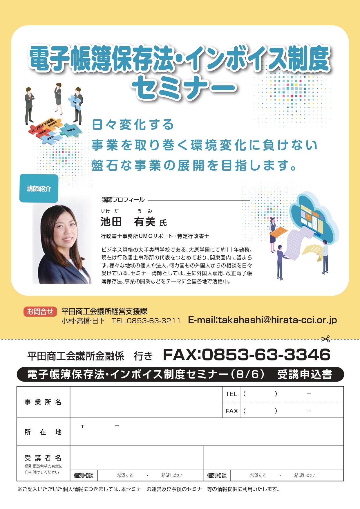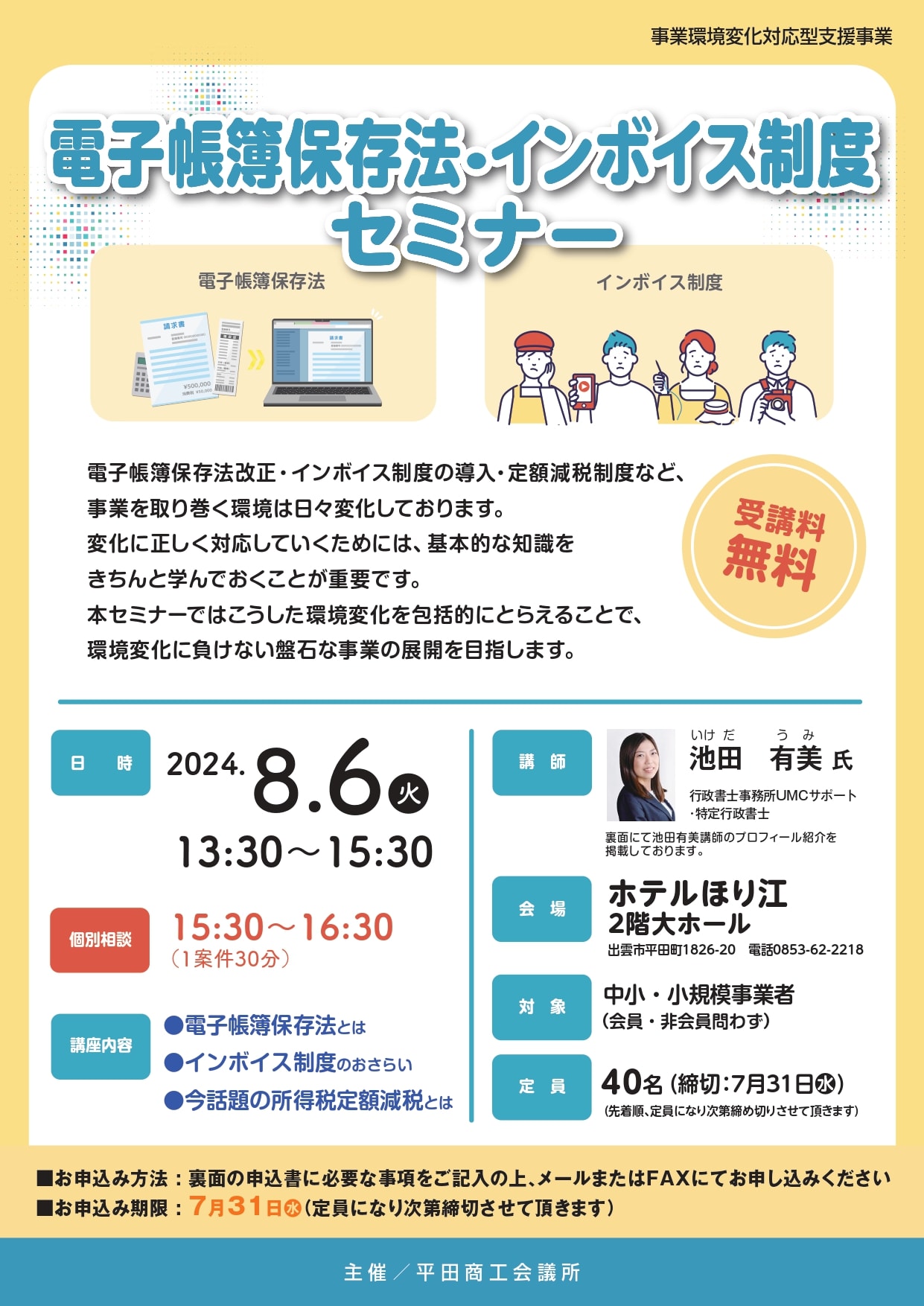 申込み・問合せは平田商工会議所商工振興係(TEL:0853-63-3211 小村・高橋・日下)まで。